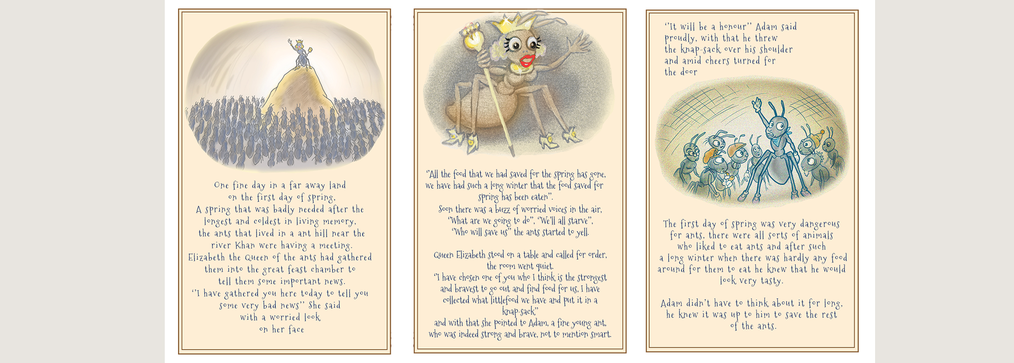 Adam Ant has to find food for the Anthill at the end of a terrible winter, and has a non-stop series of adventures before returning in triumph to the Anthill.